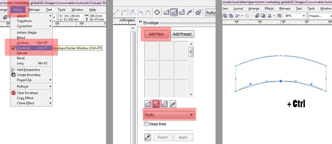 To bend the strip later to a muffin case, bend the graphics in Adobe Illustrator with the warping tool or in Corel Draw with the tool ‘Envelope’ (menu: Effects > Envelope > Simple arc > putty). Hold Ctrl and then drag the lines to the desired arc.​