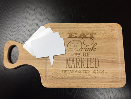 Open the cheese board graphic file in your graphics program and add the first names of the wedding couple and the wedding date at the bottom of the page. Use any font you like. Resize the image to fit on your cutting board and send it to the laser.